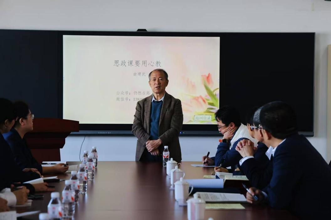 研讨交流会上,与会人员观看了央视12分钟《新闻联播》视频,重温了习近平总书记2019年3月18日在主持召开学校思想政治理论课教师座谈会上的重要讲话精神。曲建武教授以“思政课要用心教”为题,结合四十余年思政教育一线的实践,深情回顾七年前参会的难忘场景,分享感悟体会。他强调,做好思政课教师必须坚定理想信念、夯实理论素养、强化政治意识,要主动创新教学方法,坚持理论联系实际,推动思政小课堂与社会大课堂深度融合,引导学生在实践中体悟真理力量,坚定“四个自信”;思政课教师要常怀仁爱之心,以真心关爱学生、以真情走进学生心灵,让思政课真正成为有温度、有力量、能育人的关键课程。互动交流中,与会教师围绕“大思政课”如何建设、如何推进实践教学等问题与曲建武教授进行了深入探讨。曲建武教授以鲜活案例、朴实语言答疑解惑,分享育人心得与为师情怀,他引用杜甫《望岳》中“会当凌绝顶,一览众山小”,勉励思政课教师胸怀家国、勇攀育人高峰。